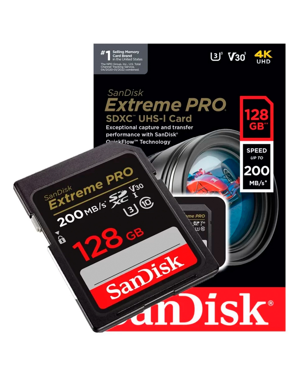 Cartão de memória Sandisk 128GB 200Mb/s EXTREME PRO 4K UHD. Se o seu dispositivo não suporta o padrão V30, este cartão também suporta o padrão U3, que também garante velocidades mínimas de gravação de 30 MB/s.